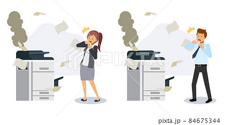 Business people in office concept. Problem at office, broken printer, messy,office equipment.Flat vector 2D cartoon character illustration.