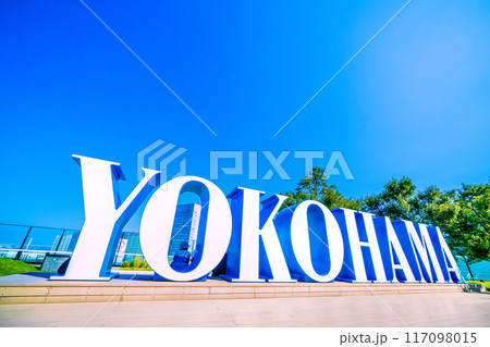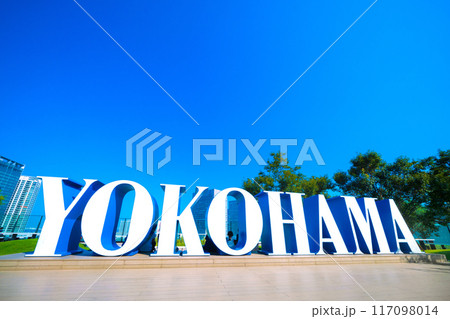 日本の横浜都市景観 ベイブリッジが一望できる屋上広場の大きな「YOKOHAMA」ローマ字モニュメント