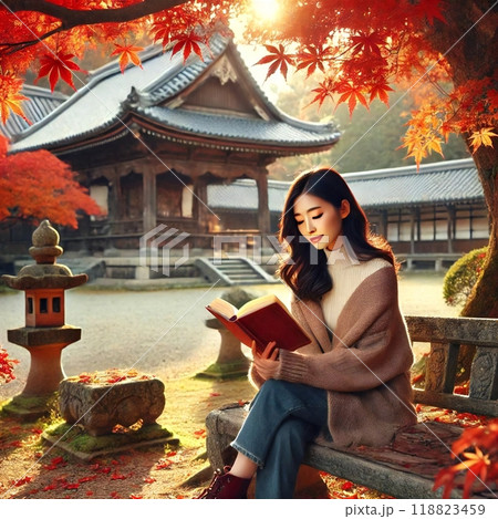 歴史ある庭園の石のベンチに座り、紅葉に囲まれて本を読む女性の穏やかなひとときの場面を生成で描きました
