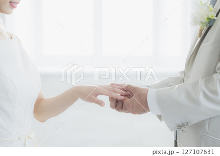 指輪交換をする新郎新婦