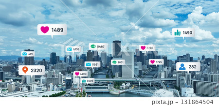 現代都市とソーシャルネットワークのコンセプトイメージ バナー・広告向け横長ビジュアル