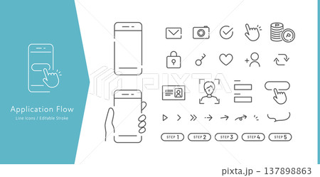 スマホで申込み・契約の流れ・登録の手順作成に便利なベクターアイコンセット (線画・モノクロ)