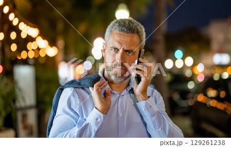 Business communication night city. Business negotiation call. Phone call to boss. Communication and negotiation. Businessman talking on phone outdoor. Businessman phone call. Total success