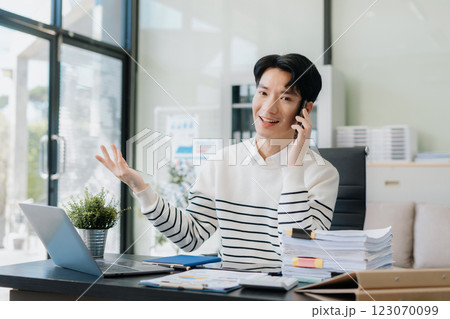 Asian Businessman Talking on the phone and using a laptop with a smile while sitting at office