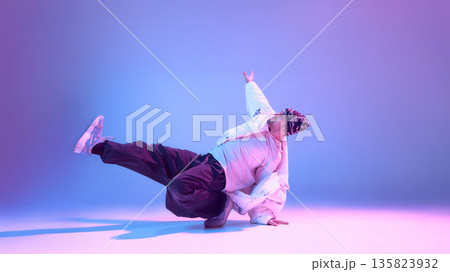 Street dancer holding low balance pose with raised arm in studio lighting.