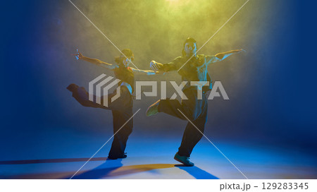 Hip-hop dancers performing mid-air with outstretched arms and bold attitude