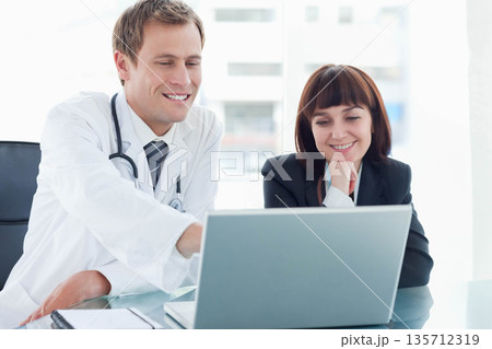 Diverse coworkers in medical coat examining laptop at glass desk at office with stethoscope and pen