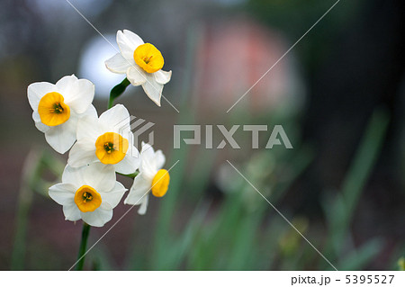 冬の庭に咲く白と黄色のフサザキスイセンの花