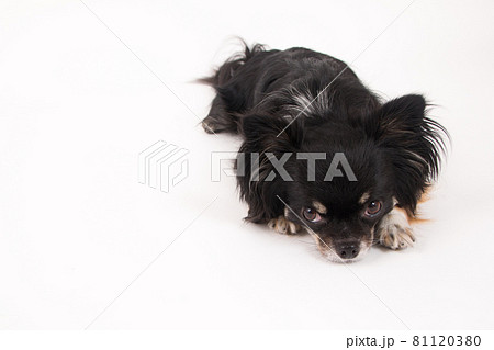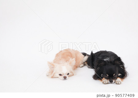 白い背景で床にぺったりフセをする二頭のロングコートチワワ