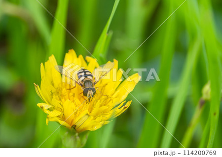 タンポポの蜜を吸うフタホシヒラタアブ(メス)