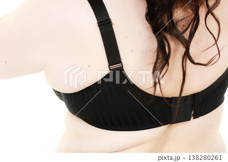 Woman wearing bra back view. Clasp band detail.