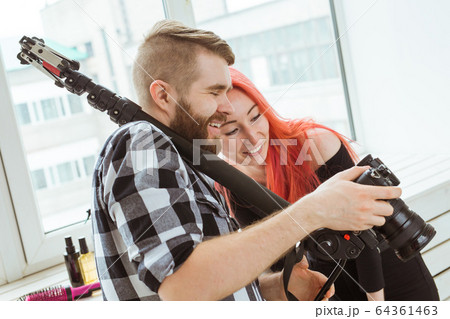 Video production, shooting advertising and content for social networks - Operator working with a camera on his shoulder and shows the girl footage.