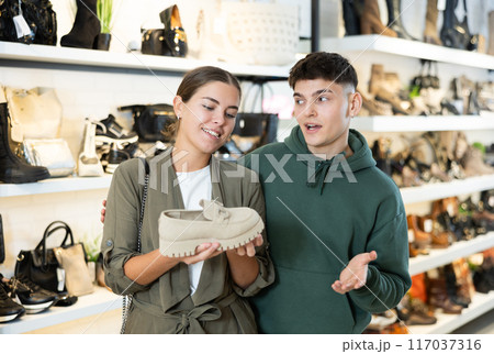 Young man with female friend view moccasins in footwear store