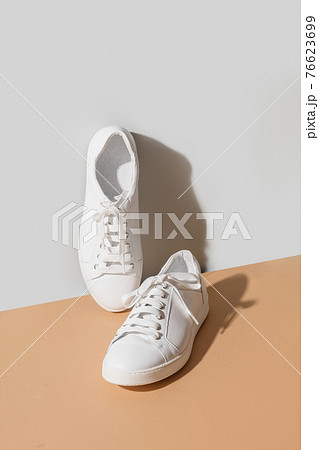 White women's new gumshoes on grey and beige background.
