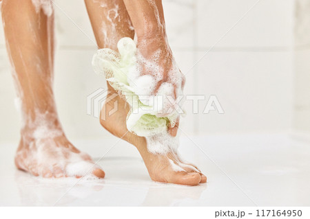 Woman washing her legs with foam bubbles and bath sponge while taking shower in the bathroom