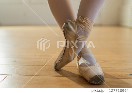 Worn ballet pointe shoes on feet in dance class. Well worn pointe shoes of ballet dancer. Classical ballerina woman in dance studio. Classical pointe shoes for dance training. Ballet school concept