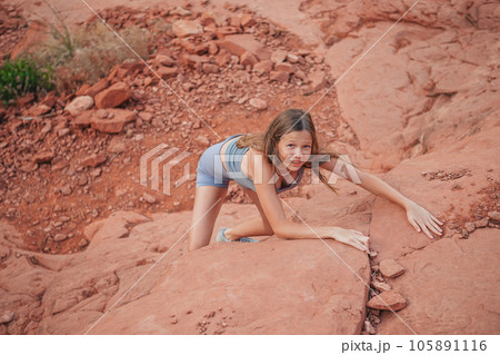 Young girl climbs in red mountains on trail