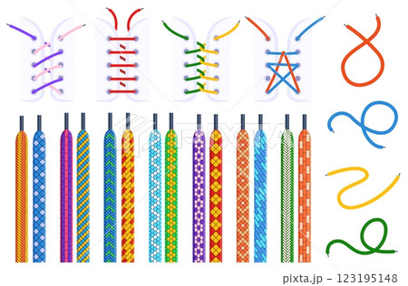 Different shoelaces and lacing. Stylish shoelace geometric design. Sneakers boots laced types. Decorative textile soft ropes, nowaday vector set