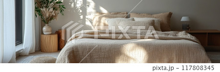 Cozy Minimalist Bedroom with Natural Light and Neutral Tones Featuring Comfortable Bedding and Elegant Decor