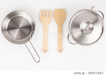 Set of kitchen utensil, stewpot, frying pan and chrome cookware hanging on shelf