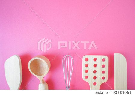 赤い背景と木製キッチン用品