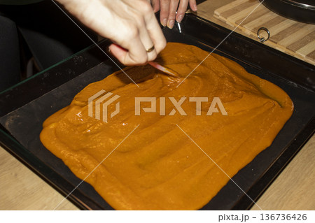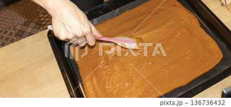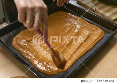 Person spreads, brown, heavy, sugary cream on a baking tray
