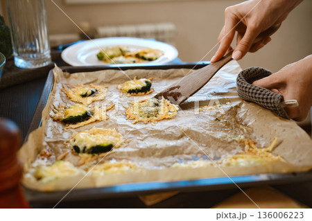 Unrecognizable woman transfers smashed broccoli with cheese from baking sheet to plate