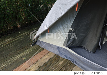 テントの設営をするカップル・キャンプ・アウトドアレジャー