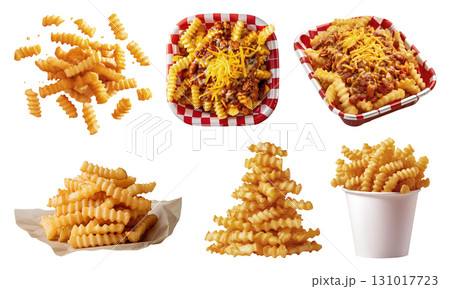 Crinkle cut wavy potato french fries fry, many angles view side top front pile, paper bucket, food tray, chili cheese, fly scattered on transparent cutout PNG. Mockup template