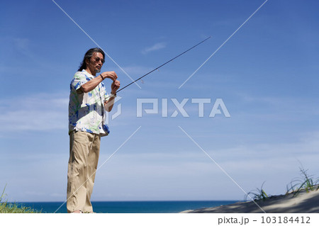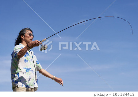 青空のもとで釣りをするミドルシニア男性