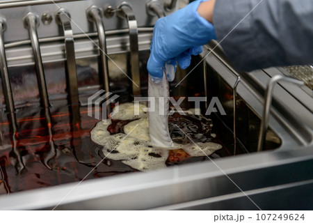 業務用フライヤーで魚を揚げる、揚げ物、魚のフライ