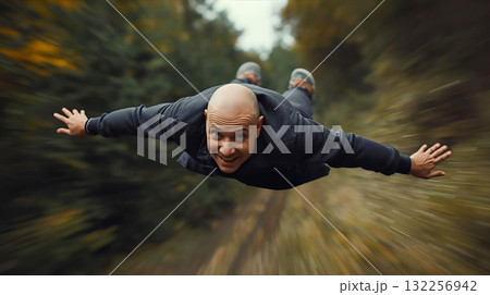 自然の中を高速で飛ぶ笑顔のはげた男性