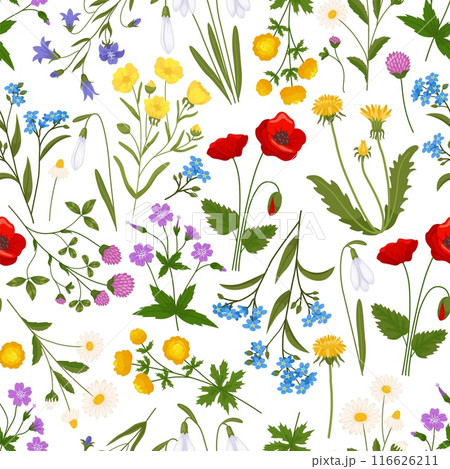 Meadow flowers seamless pattern. Wild summer botanica. Repeated print. Daisies and dandelions. Poppy buds. Cornflower branches. Field blooming herbs. Recent vector floral background