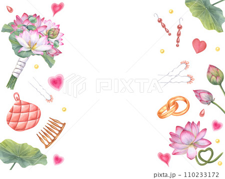 Female wedding accessories. Clutch, golden rings, pearl hairpins, earrings, bride bouquet. Pink hearts. Lotus flower, eucalyptus. Watercolor illustration isolated on white. For invitation, greeting
