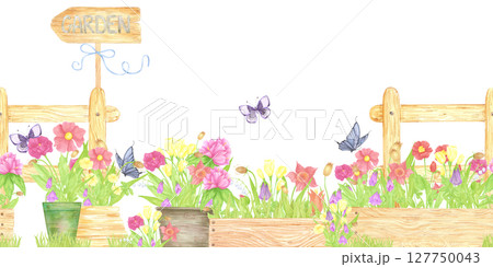Hand drawn watercolor blooming flowers in pots and boxes. Palisade composition seamless border isolated on white background. Can be used for textile, postcard, scrapbook and other printed products.