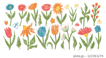 Spring flowers crayon drawn set. Tulip, daisy, chamomile and marguerite plants doodle. Summer aster floral kids elements. Chalk style childish shape. Pencil vector illustration on white background.