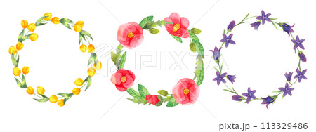 Set of wreaths of flowers with leaves.Round frame of camellia,tulip and bellflower.Botanical watercolor illustration.Hand drawn isolated art.Clipart for wedding invitations,cards,birthday.Vector.