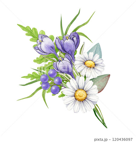 Springtime floral elegant decor from garden flowers vintage style illustration. Hand drawn crocus, daisies, fern decor element on white background. For holiday festive decor and seasonal design