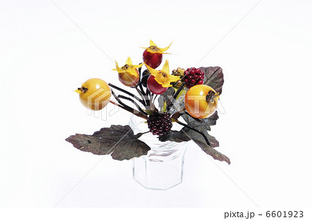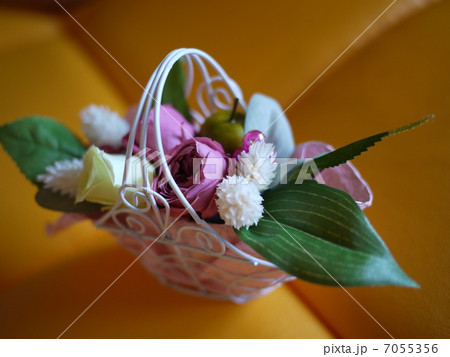 白バックに造花のアレンジ