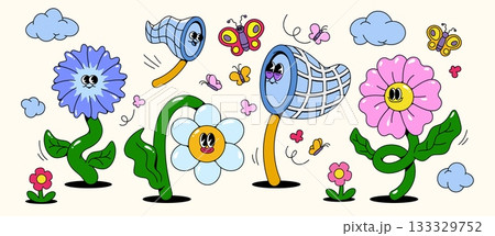 Vector set of clip art colorful flower heads isolated from background. Collection of hand drawn cartoon floral elements