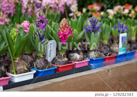 Young Hyacinthus orientalis flowering plant in the ground in seedling trays in a garden shop - preparation for planting gardening flowers concept. Horizontal. Daylight.