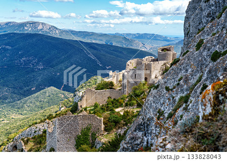 The Cathar medieval castle of Peyrepertuse in the Aude department, southern France situated in the French Pyrenees