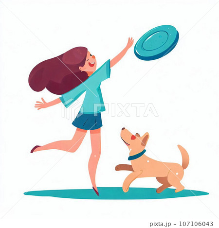 フリスビーで遊ぶ犬と女の子