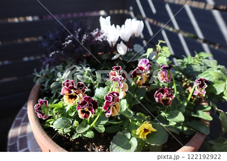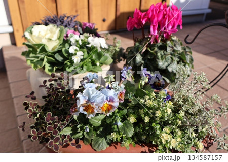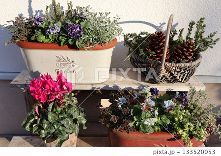 フリルビオラ、シクラメン、ハボタンの寄せ鉢