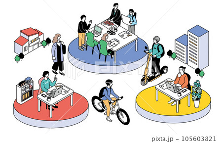 アイソメトリック オフィスワークとリモートワークをする人々のシンプルなイラスト