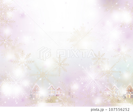 優しい色使いの北欧風オシャレな冬の街並みとキラキラ雪の結晶の降るフレームイラスト壁紙素材