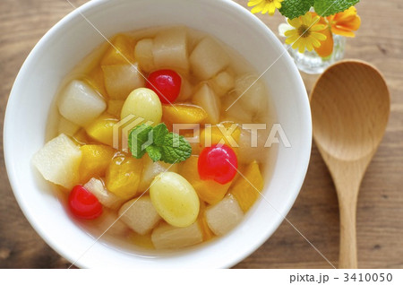 牛乳かんやパイン、マンゴー、白桃、チェリー、ミカン等のフルーツが入ったフルーツポンチを白背景で撮影