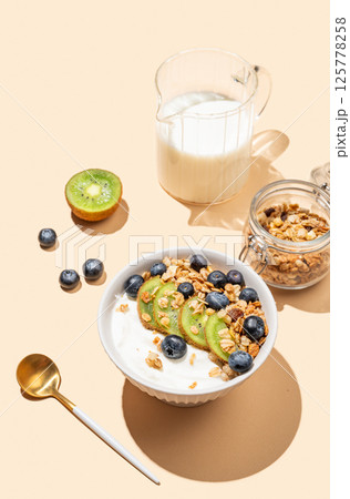 Natural yogurt with granola, kiwi and blueberries in a bowl on a beige background.