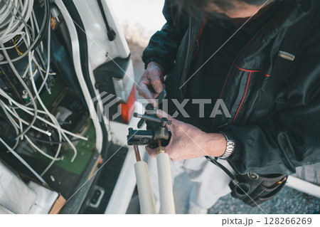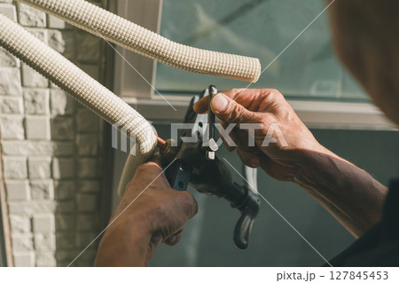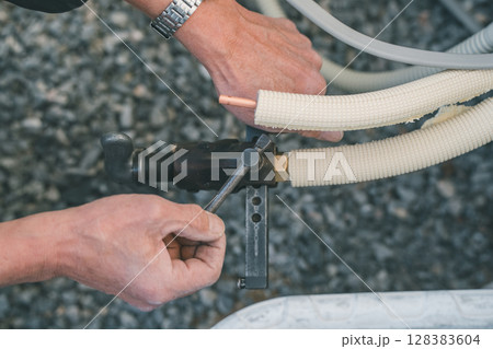 エアコン取付工事 冷媒管の配管のフレア加工をする男性手元