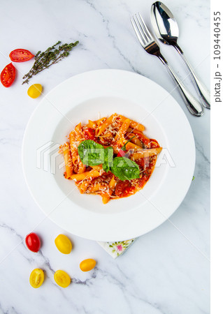 pasta in tomato sauce with cheese and herbs top view